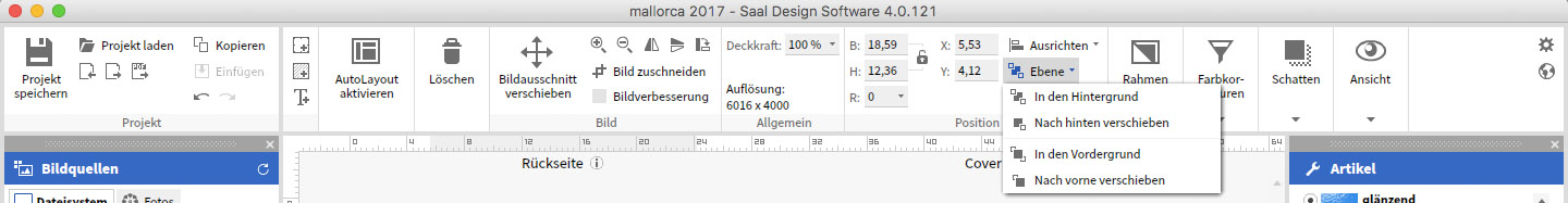 Zur korrekten Platzierung eurer Fotos bietet die obere Menüleiste den Befehl „Ausrichten„. Hier kann das selektierte Bild entweder basierend auf der Doppelseite oder aber basierend auf einer Einzelseite (dazu unter Ausrichten Drop-Down Menü Haken setzen bei „an Einzelseite ausrichten) jeweils an dieser ausgerichtet werden: Zum Beispiel horizontal und vertikal zentriert. Praktisch und exakt!